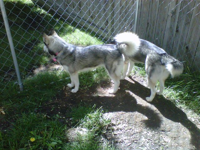 These beautiful husky-type dogs are enthralled by something outside of the chainlink fence. A squirrel perhaps?