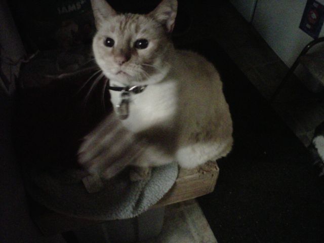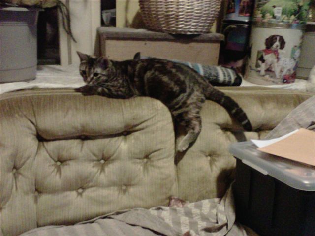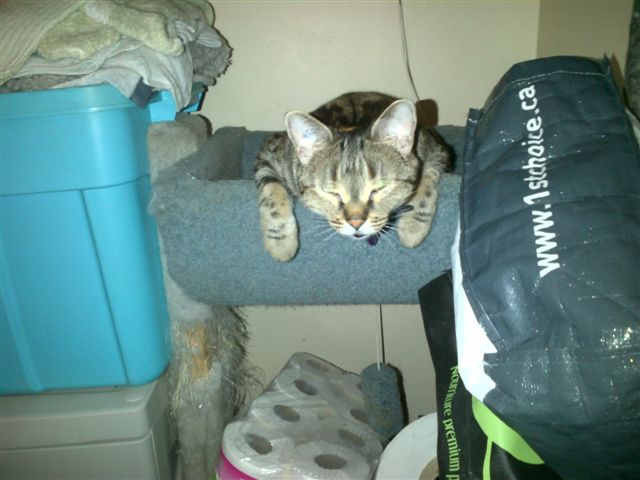 This tabby’s had a long day and is enjoying a nap in the cat tower.