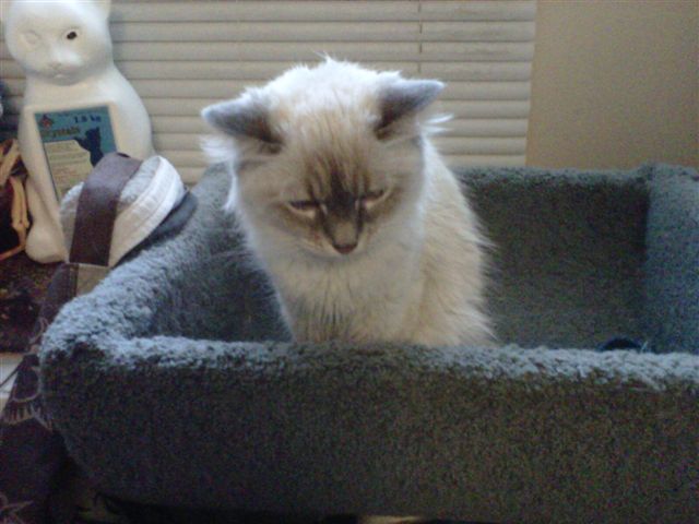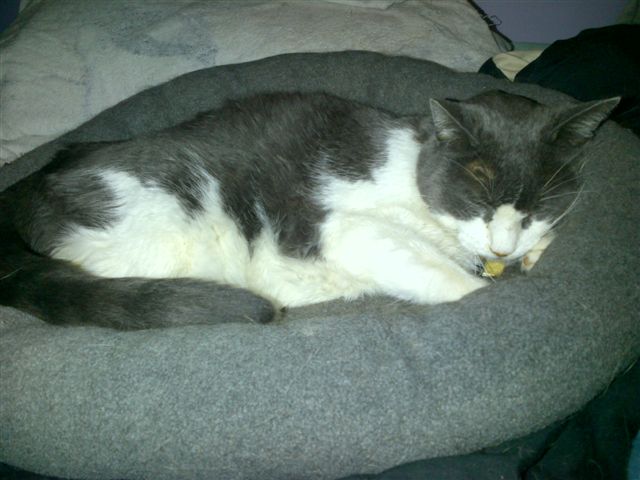 Grey and white cat taking a nap in the cat bed.
