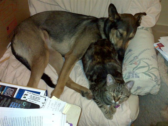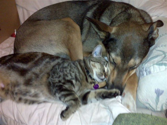 Cats and dogs can get along, as these two show. They love cuddling together in their favourite chair.